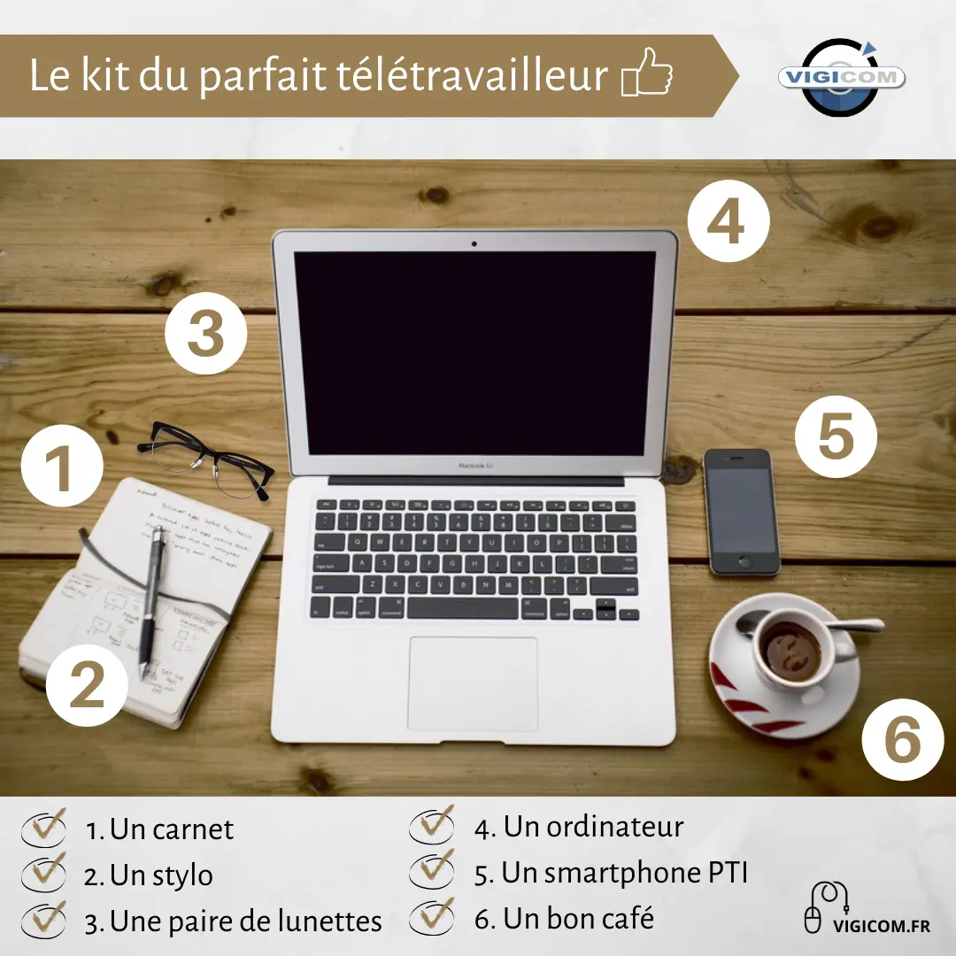 Afin que chaque salarié soit dans les meilleures conditions possibles lorsqu’il travaille à distance, VigiCom vous présente son kit du parfait télétravailleur. Il se constitue de 6 outils indispensables :